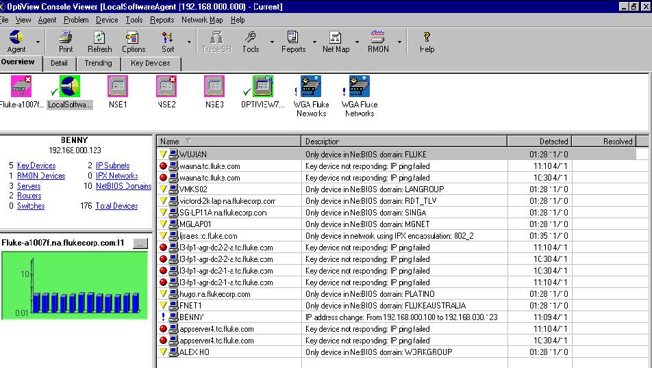通常这种看似简单的故障实际上很难直接判断其产生的原因,有时可能是网络本身的问题,或是网络应用的问题,还有时可能与网络或服务设备的配置有关。因此从哪里入手进行测试变成关键问题。为了进*步了解用户网络的整体情况,我们决定**安装*套美国福禄克公司的网络监测管理软件,以便能获得更多的网络信息。这套软件采用分布式结构,我们在用户的各个网段内分别安装*个监测站,用我们的笔记本电脑作为监测控制台与各监测站通信,获取信息并集中显示(见图二)。